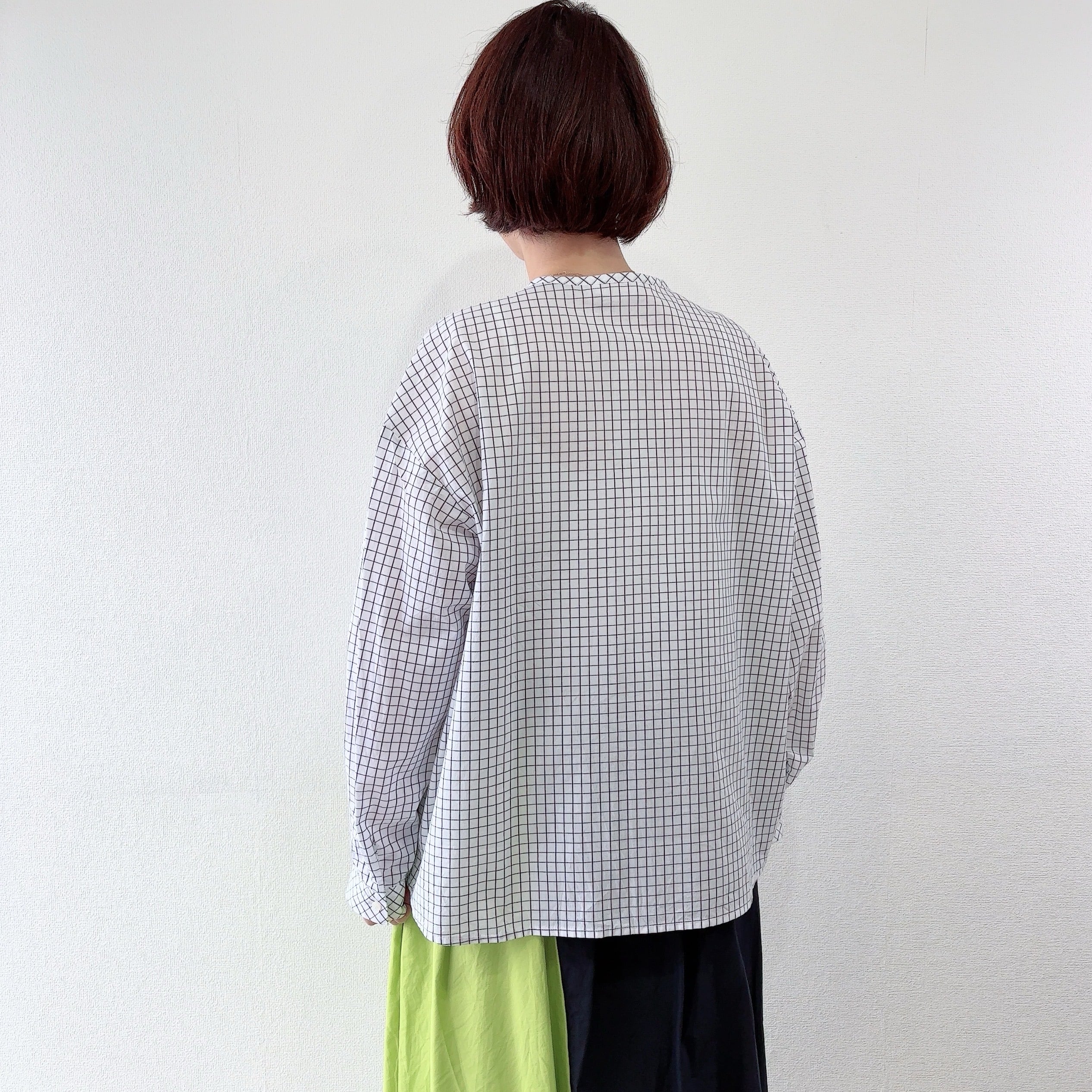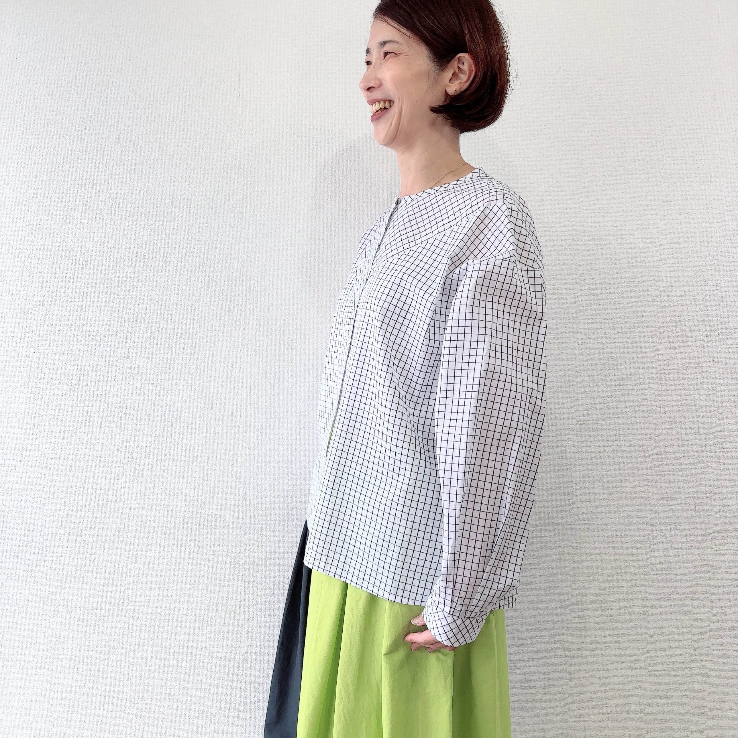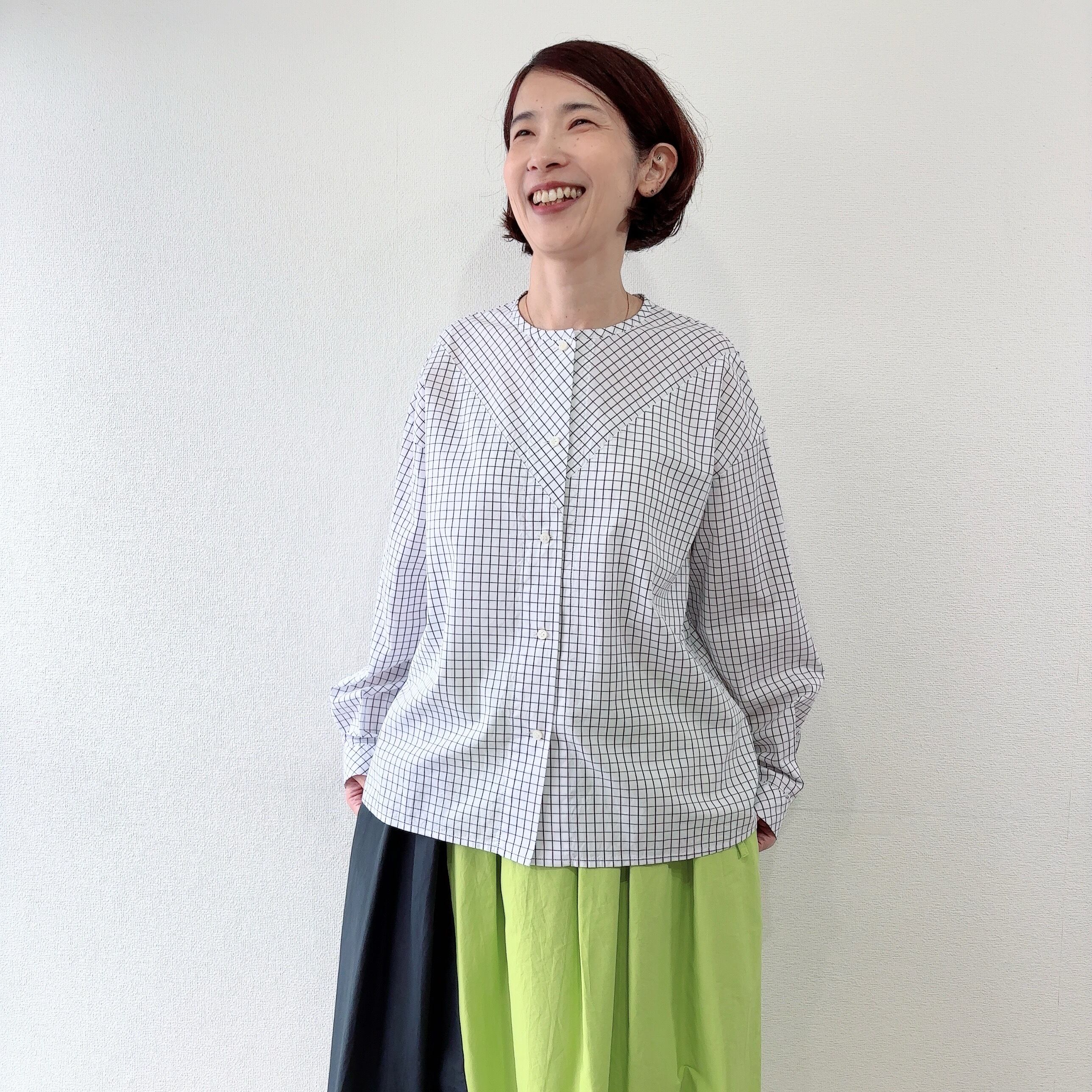 チェック柄を活かしたVバイアスヨークの長袖ブラウスです