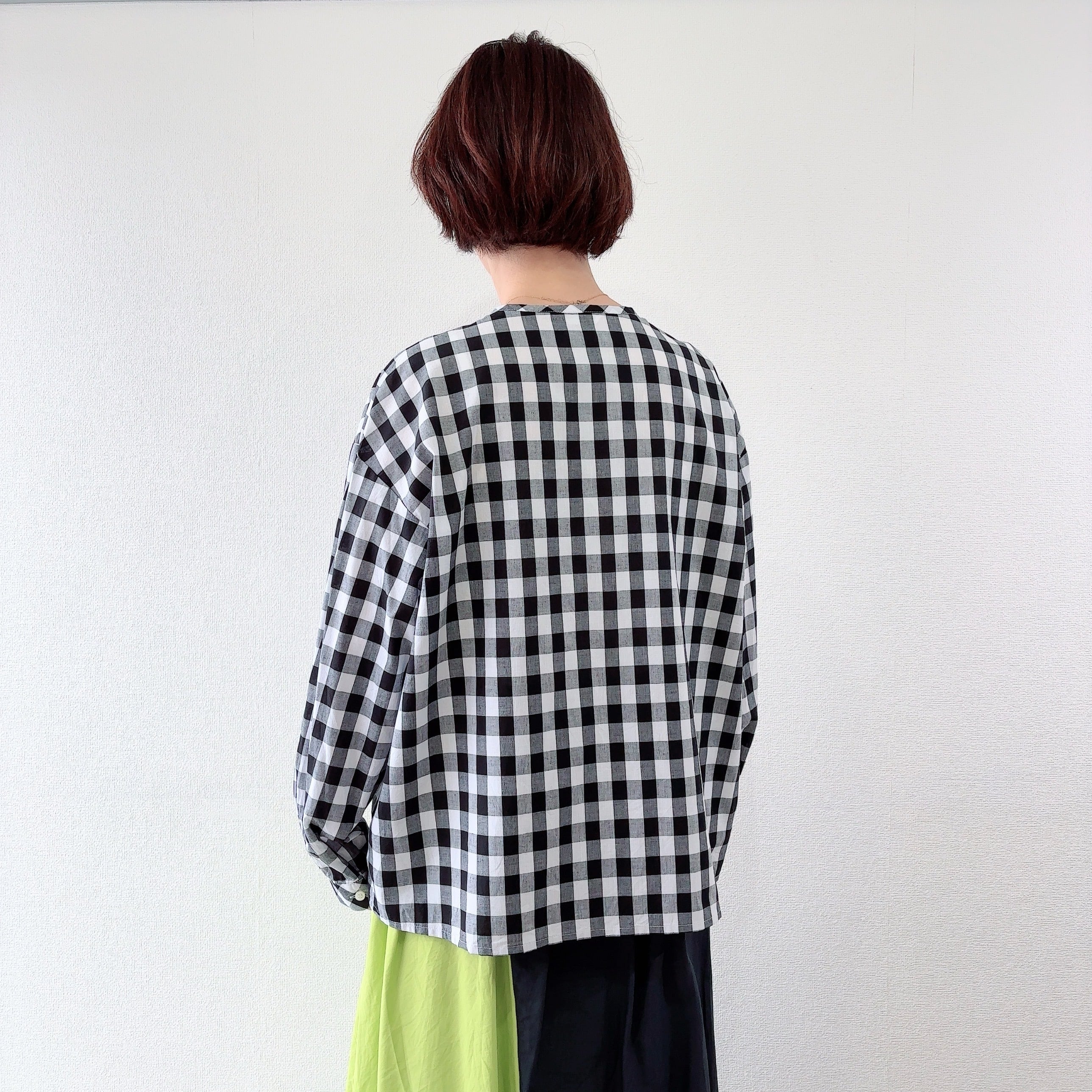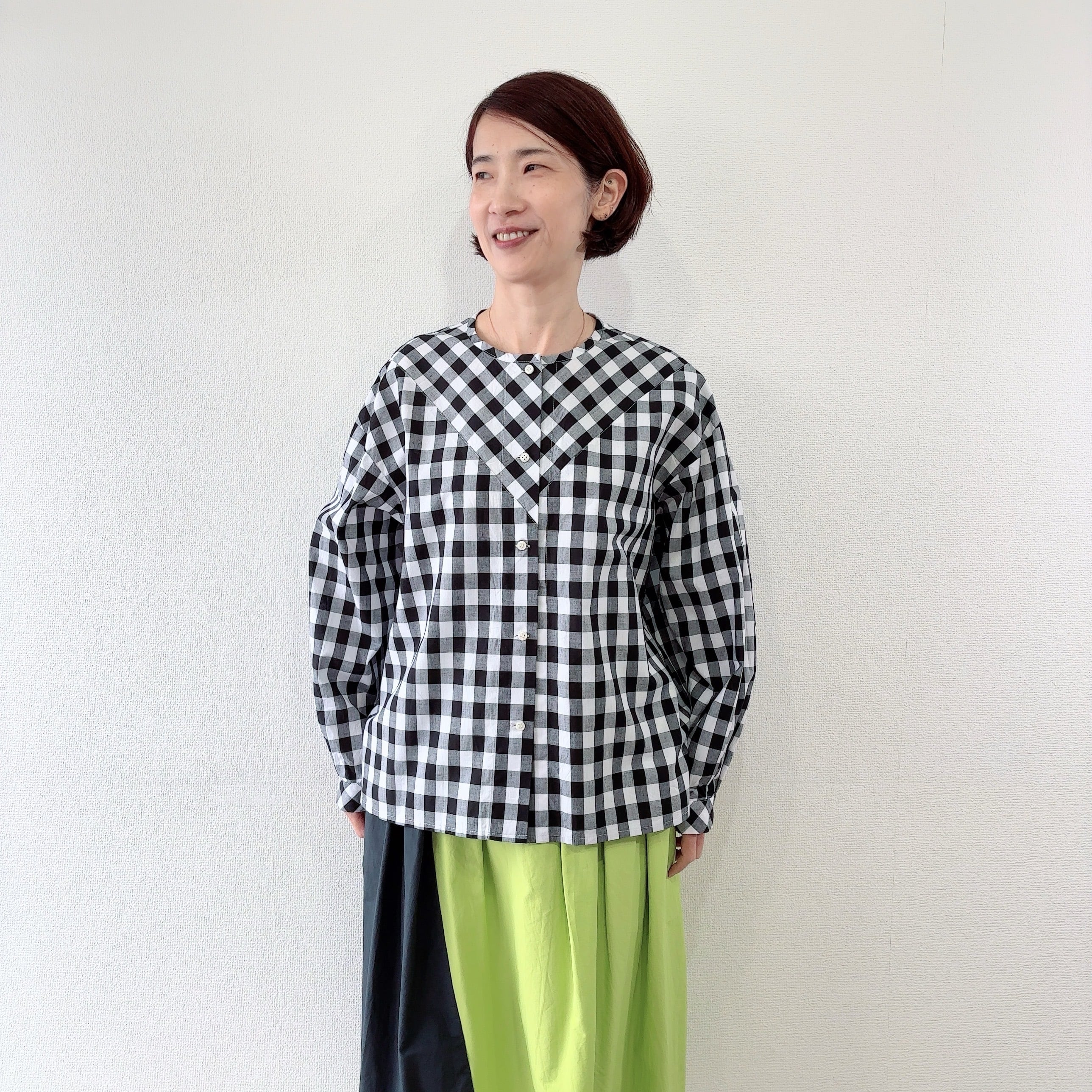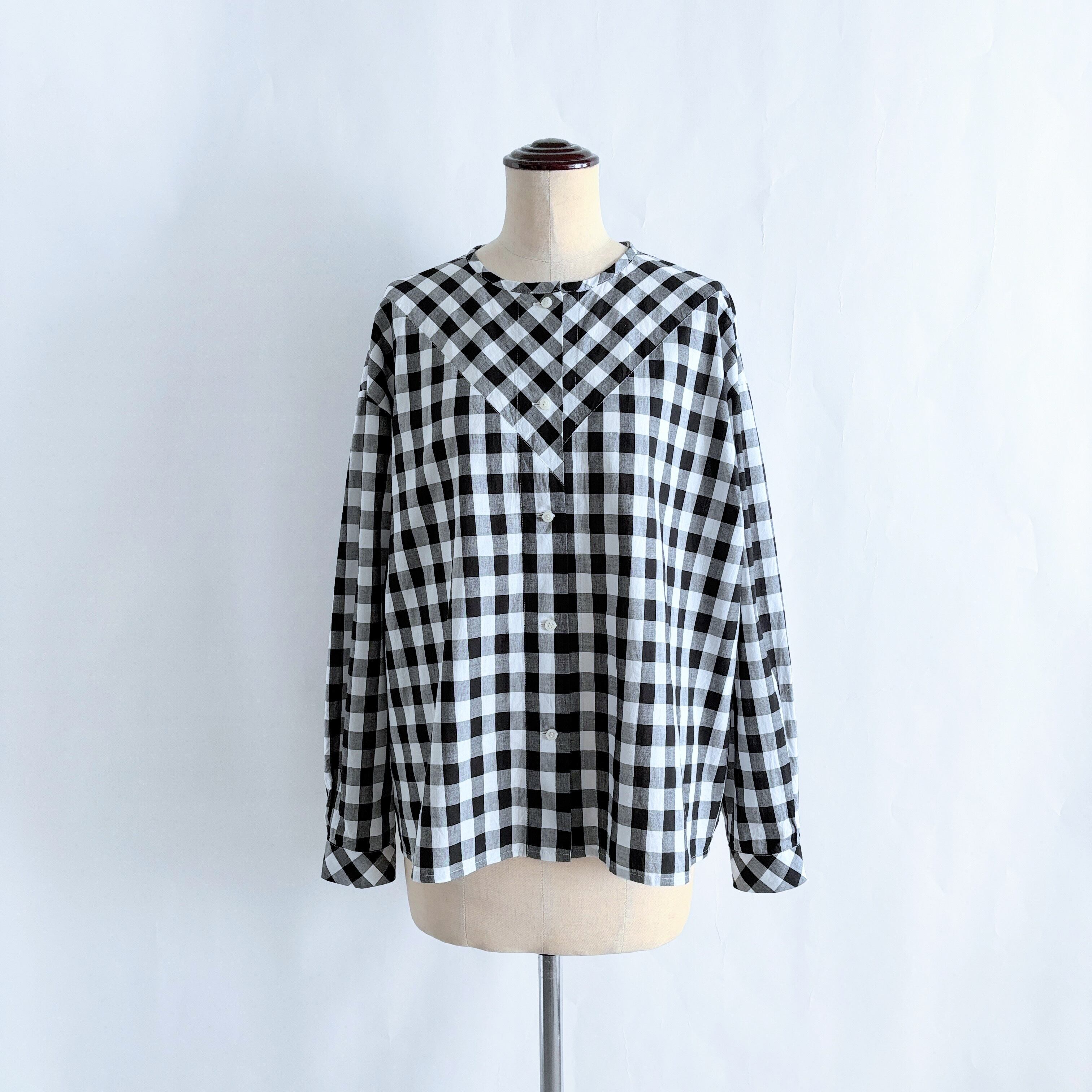 チェック柄を活かしたVバイアスヨークの長袖ブラウスです