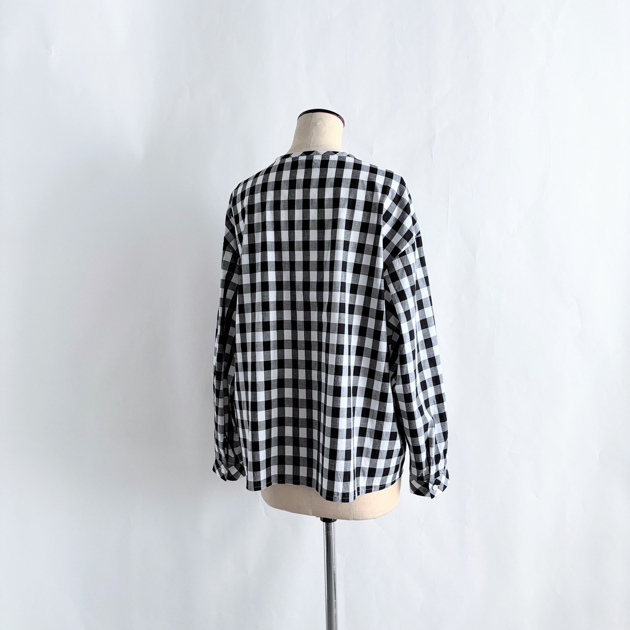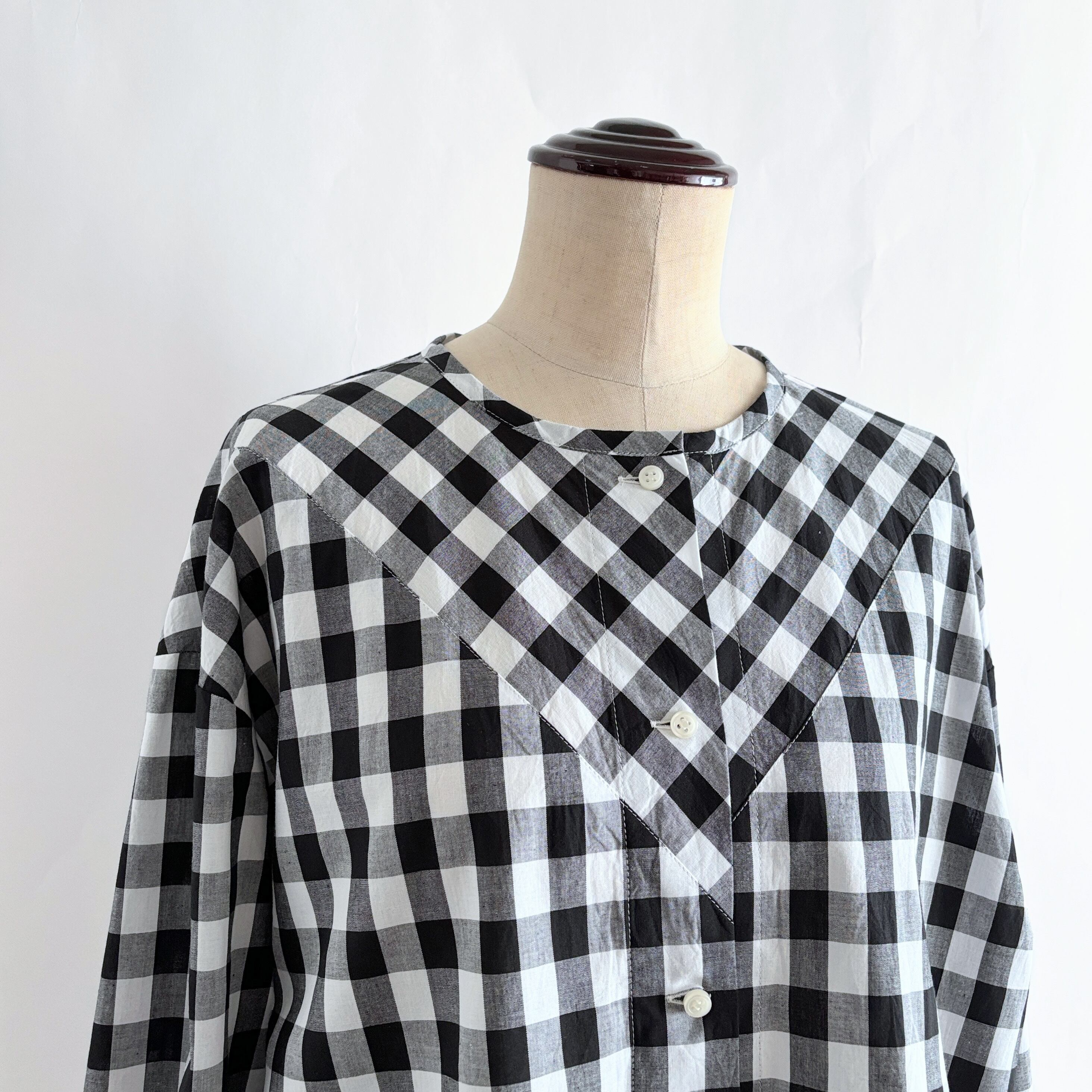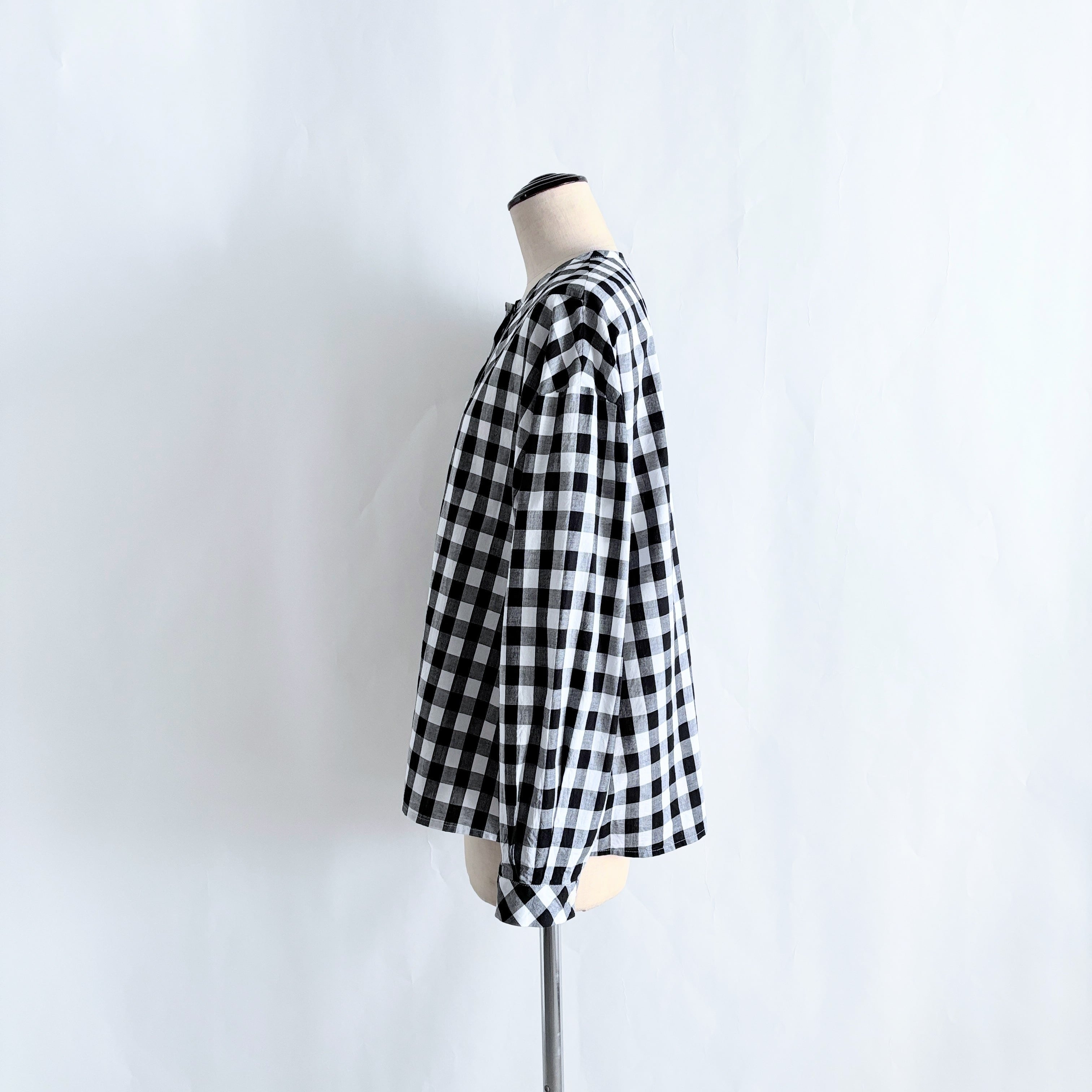 チェック柄を活かしたVバイアスヨークの長袖ブラウスです