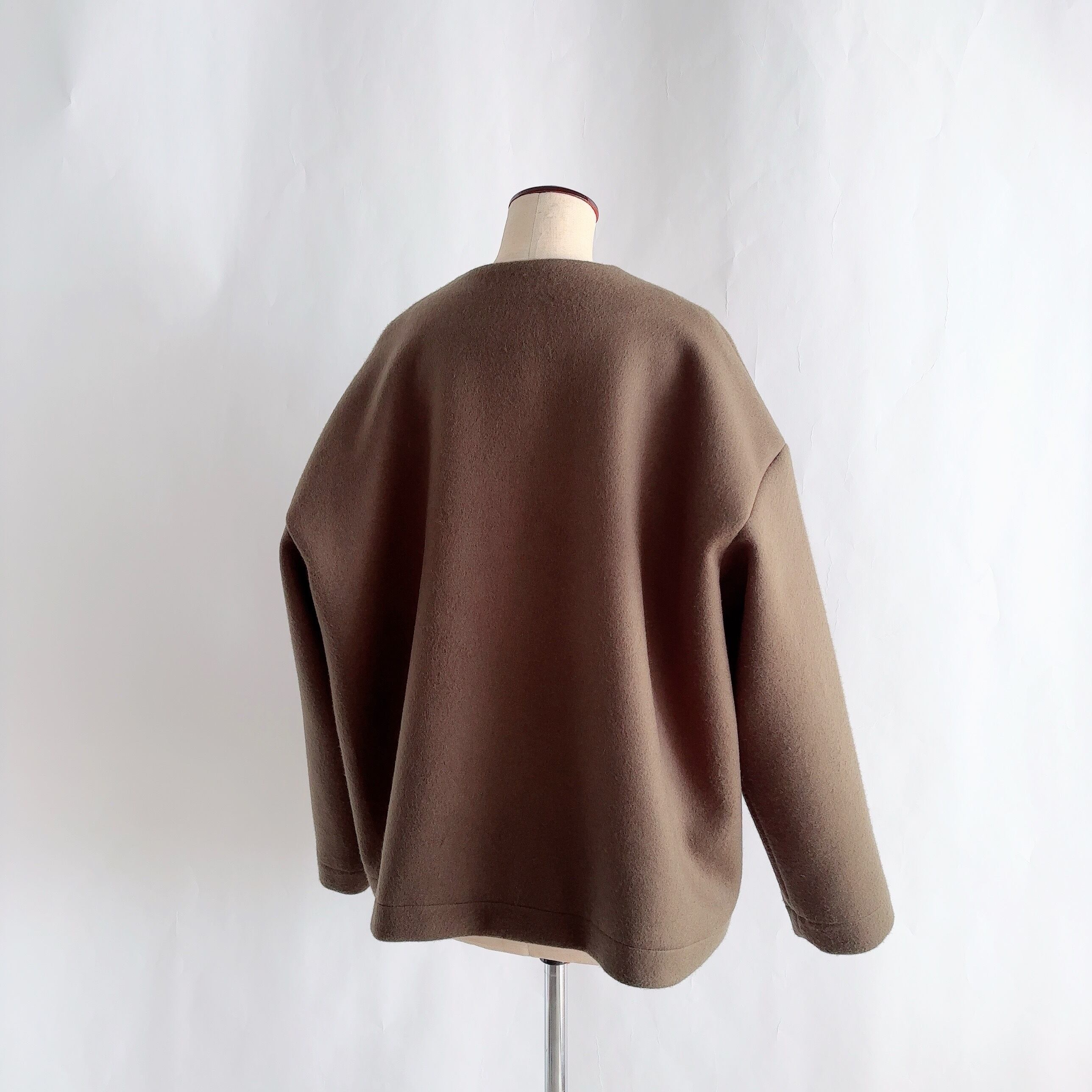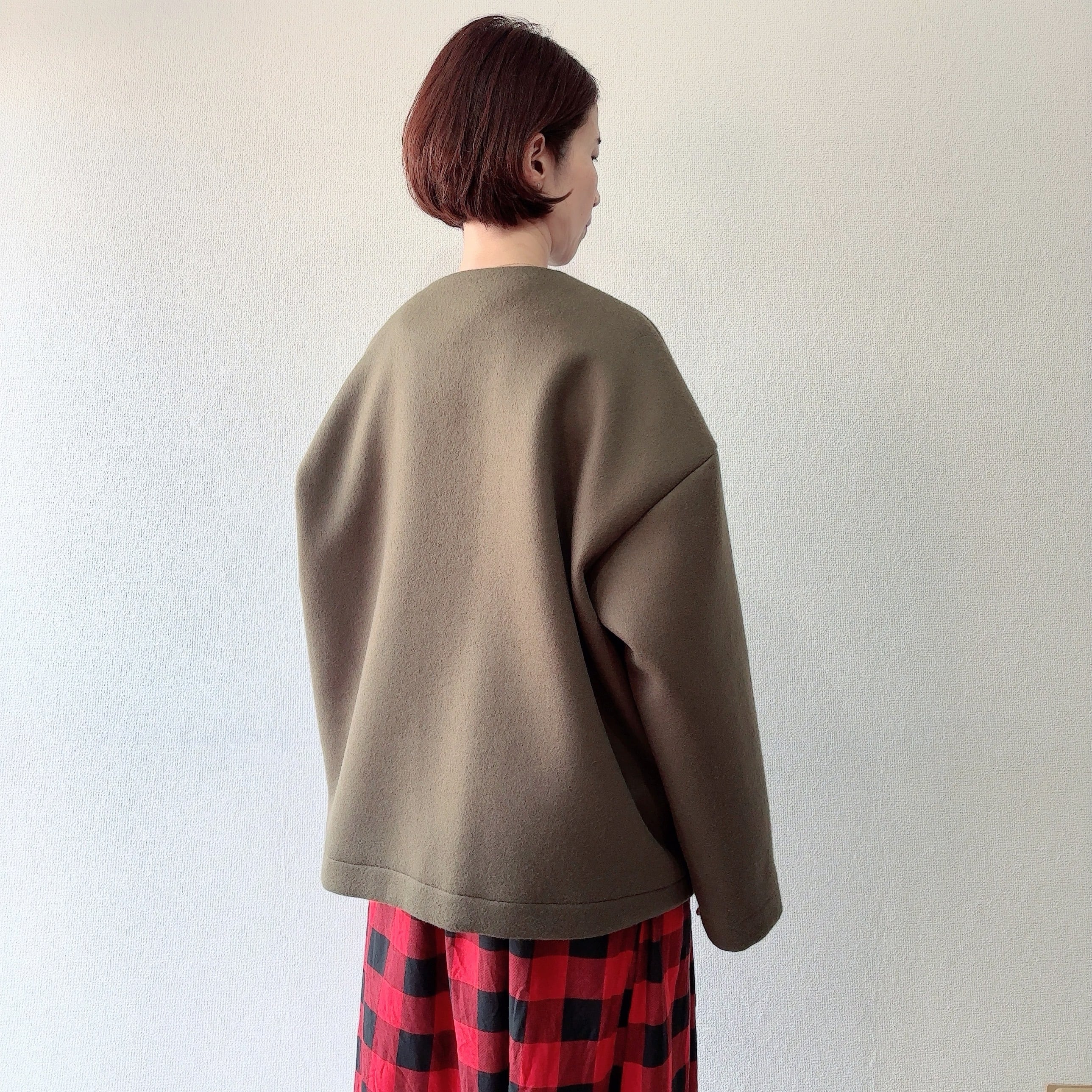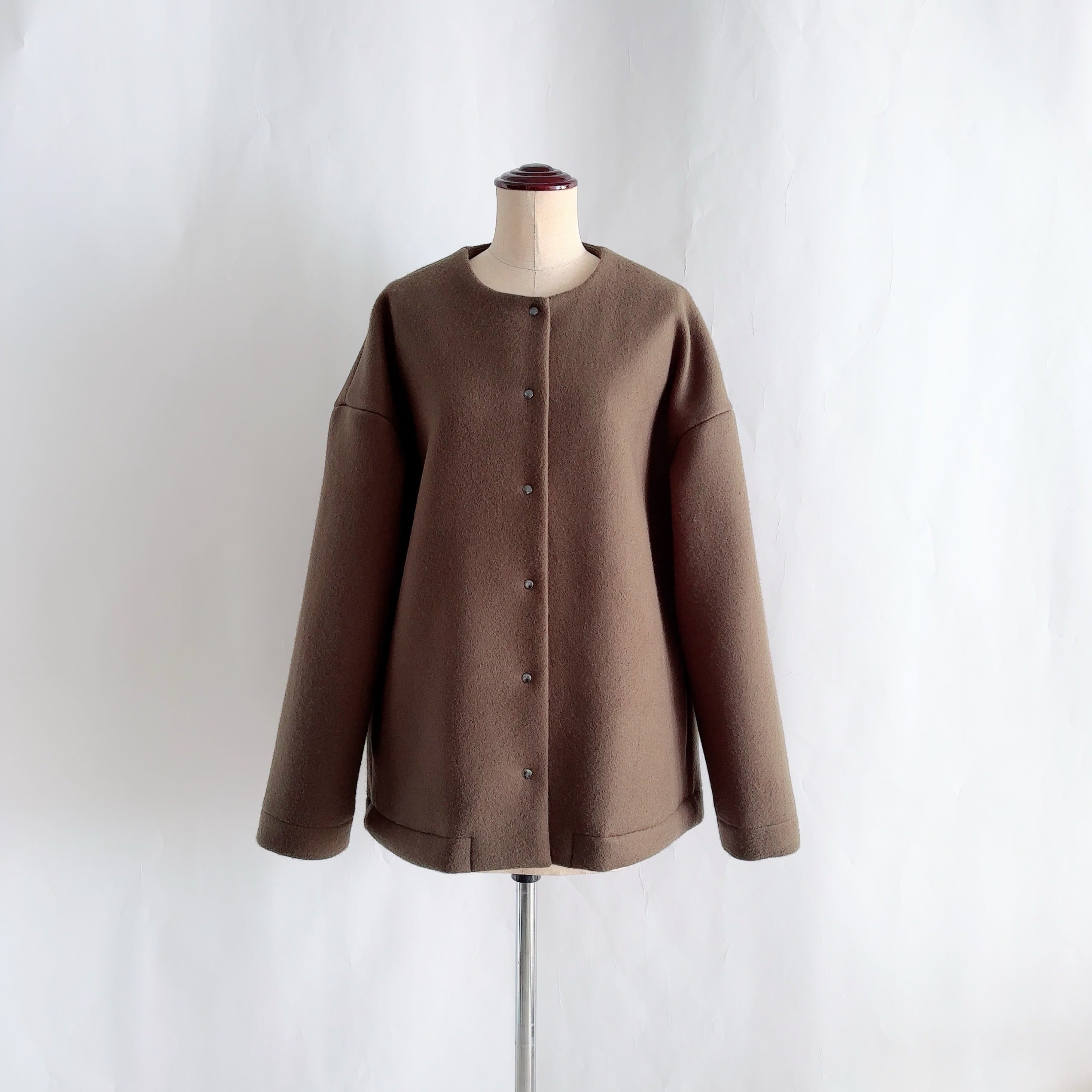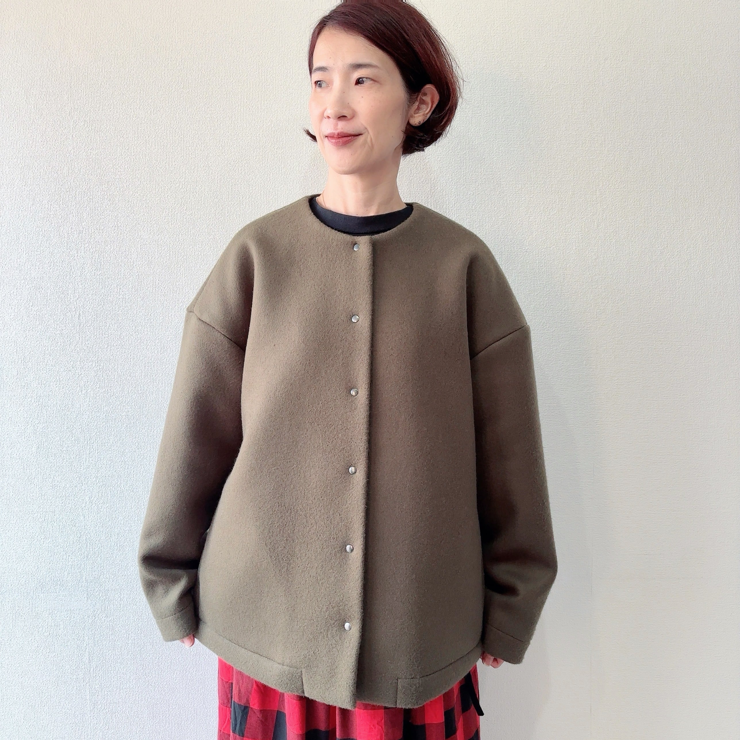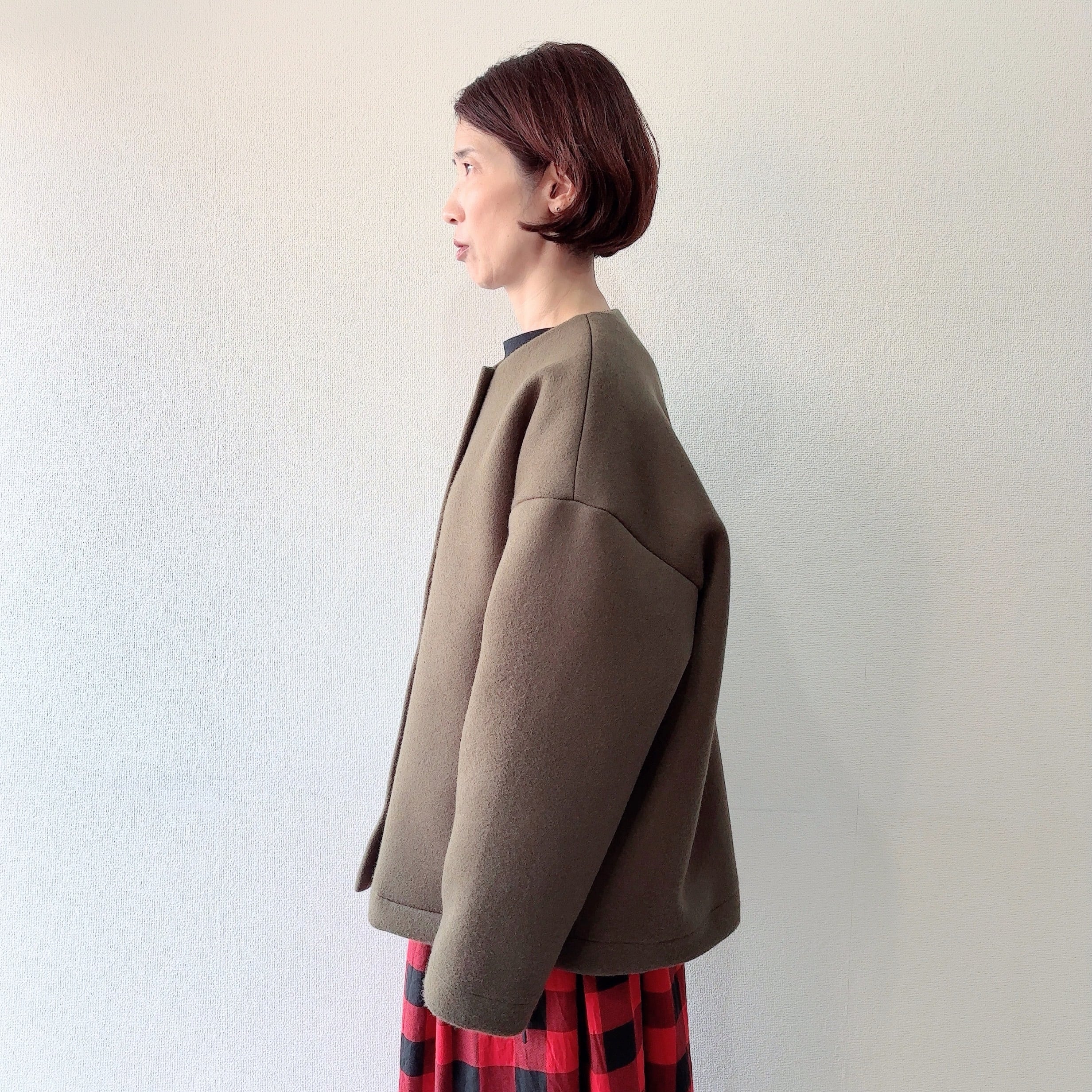 ノーカラーのジャケット丈にミニマムデザインが普段の着こなしに取り入れやすい一枚となってます